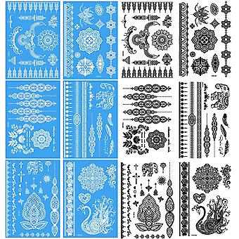 Henna Tattoos Aufkleber, weiße Spitze Ketten Mandala Fake Tattoo temporäre und schwarze Henna Tattoos für Frauen Party Rave Make-up, 12-Blatt