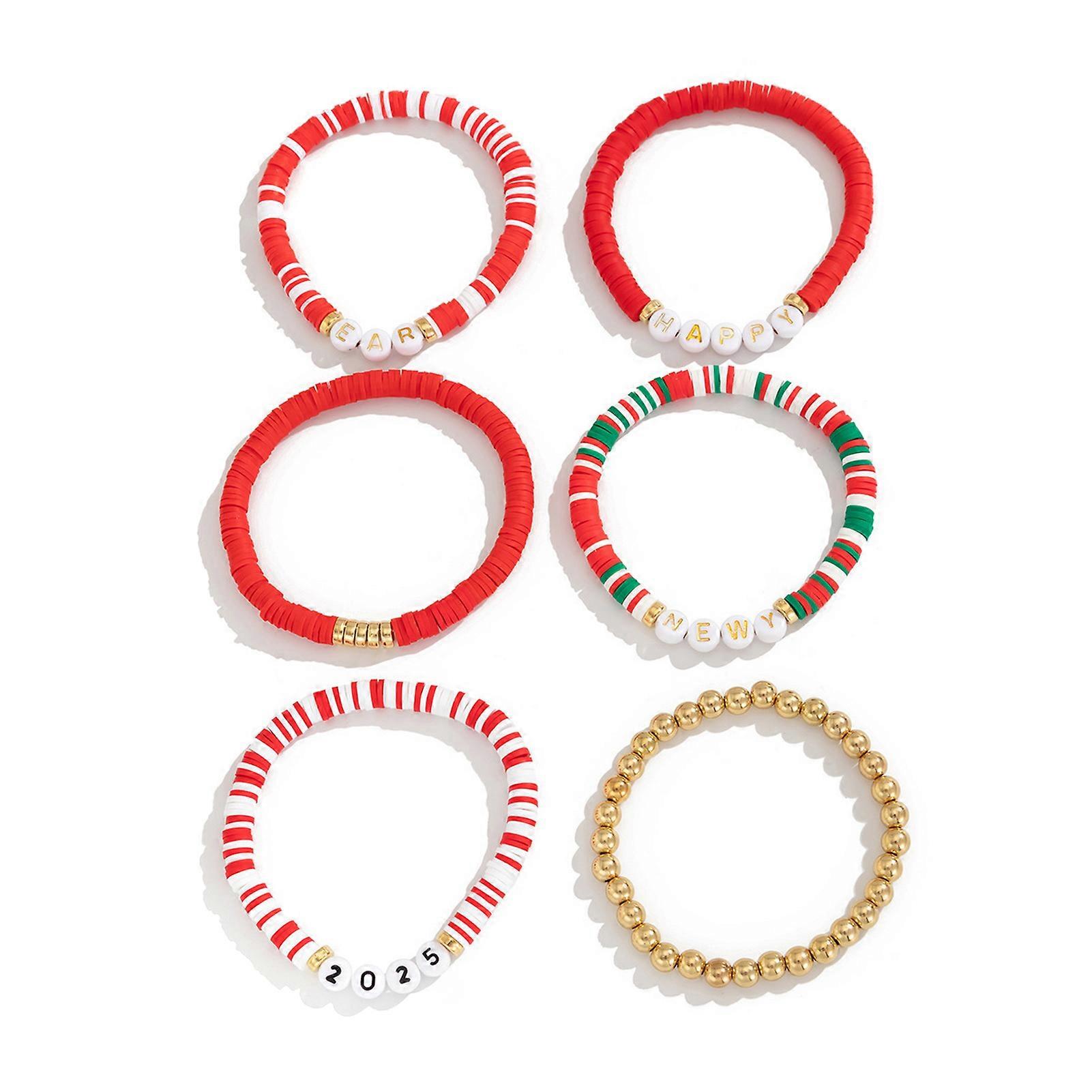 Features: Stylish and Festive: The Happy New Year Bracelet Set for 2025 is designed to add a touch of joy and celebration to any outfit. With its vibrant colors and charming letter design, it is the perfect accessory to ring in the new year. Multilayered and Trendy: The 2025 Happy New Year Bracelets feature a unique multilayer design that adds depth and dimension to your wrist. The letters are delicately crafted and arranged, creating an eye-catching and fashionable look. Comfortable and Durable: Made from smooth surface soft pottery material, the bracelets are incredibly comfortable to wear. The stretchy beads ensure a perfect fit for any wrist size, while the high-quality construction guarantees long-lasting durability. Versatile and Thoughtful Gift: This charm bracelet set makes an ideal gift for your wife, girlfriend, or mother. Its versatile design allows it to be worn on various occasions, whether it's for daily wear, dating, or shopping. It is a stylish accessory that adds a touch of elegance to any outfit. Suitable for Women and Girls: These bracelets are designed to be worn by women and girls of all ages. They make for a perfect accessory to complete any outfit, adding a touch of sophistication and style. They are versatile and can be paired with both casual and formal attire, making them a must-have accessory for any fashion-conscious individual. Specification: Material: Plastics Diameter: 18cm Include: 6* Bracelets Set