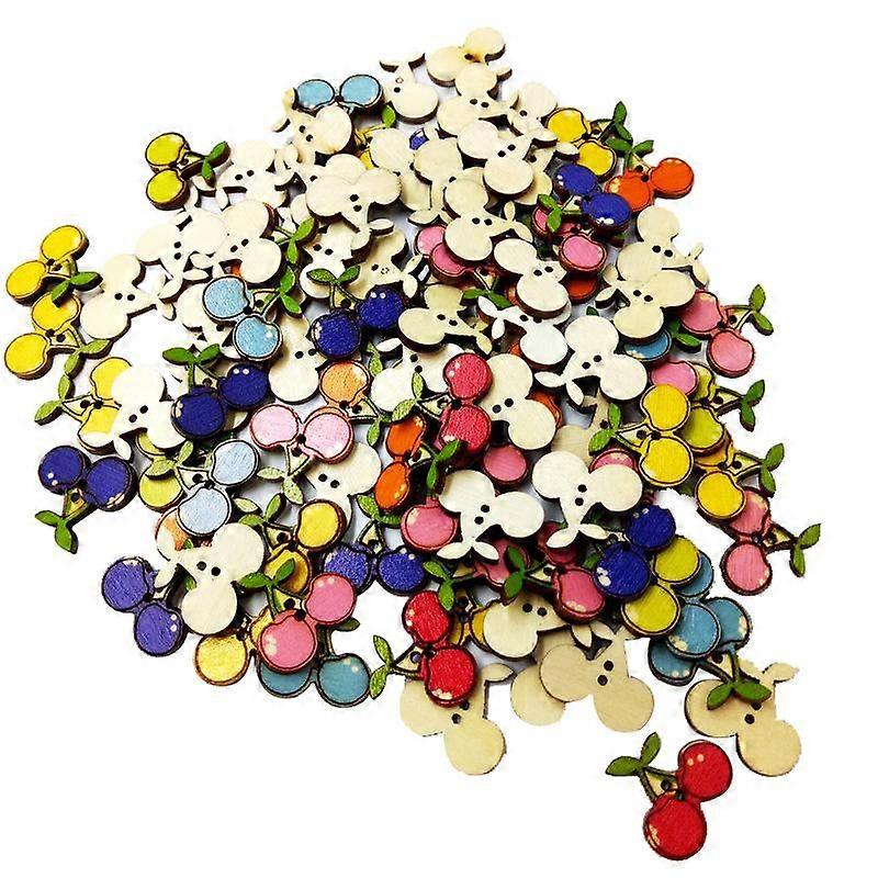 100 Pieces Assorted Cherry Shape Wood Flat 2 Holes Button for Sewing Craft