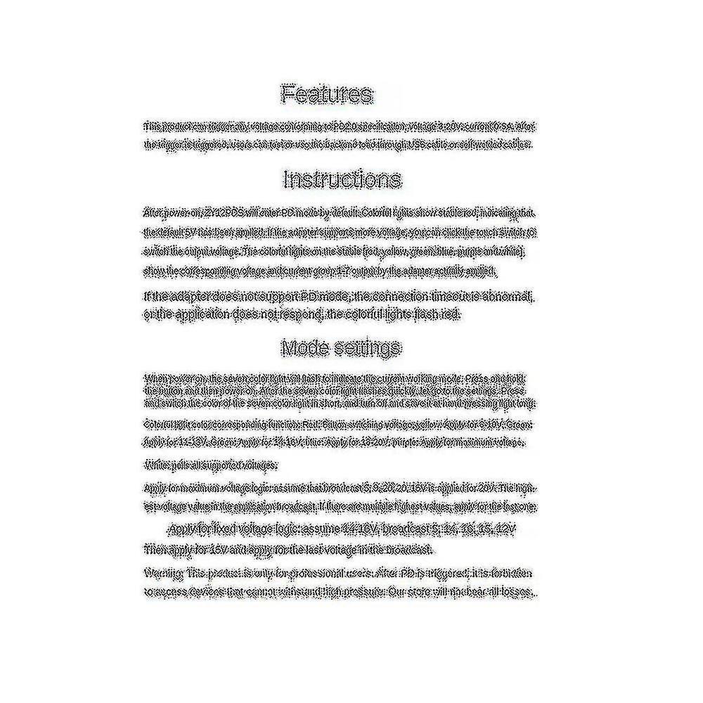 features: 1,Maximum power up to 100W.2, trigger adopts hardware protocol IC, which is more compatible than soft .3,Features ceramic capacitor filtering, anti-surge & anti-reverse connection.4,Welding positions for USB and 5.08 screw terminal are preset for making Type-C to DC cord.5,Welding the DC cable and using heat shrink tube to charge your laptop with mobile power.Specifications:Voltage: 3-20VCurrent: 0-5Acolor:greenMaterial:PCB+ metalSize:3 x 1.5 x 0.5cmThe product can trigger any voltage that follows the PD2.0 standard, and can be used for load testing via USB or cable.After being electrified, ZY12PDN enters mode(default). If indicator turns red stably, it means 5V(default) has been set up. You can tap the on-off button to switch the output voltage.The indicator flickers red under following situations: the adapter does not support mode, connection timeout or no respond to the request.Package Contents:2 x ModuleOnly the above package content, other are not included.Note: Light reflection and different displays may cause the color of the item in the a little different from the real thing. The measurement allowed error is +/- 1-3cm.