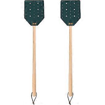 2 Pack Leather Fly Swatters with Wooden Handle and Lanyard (Dark Green)