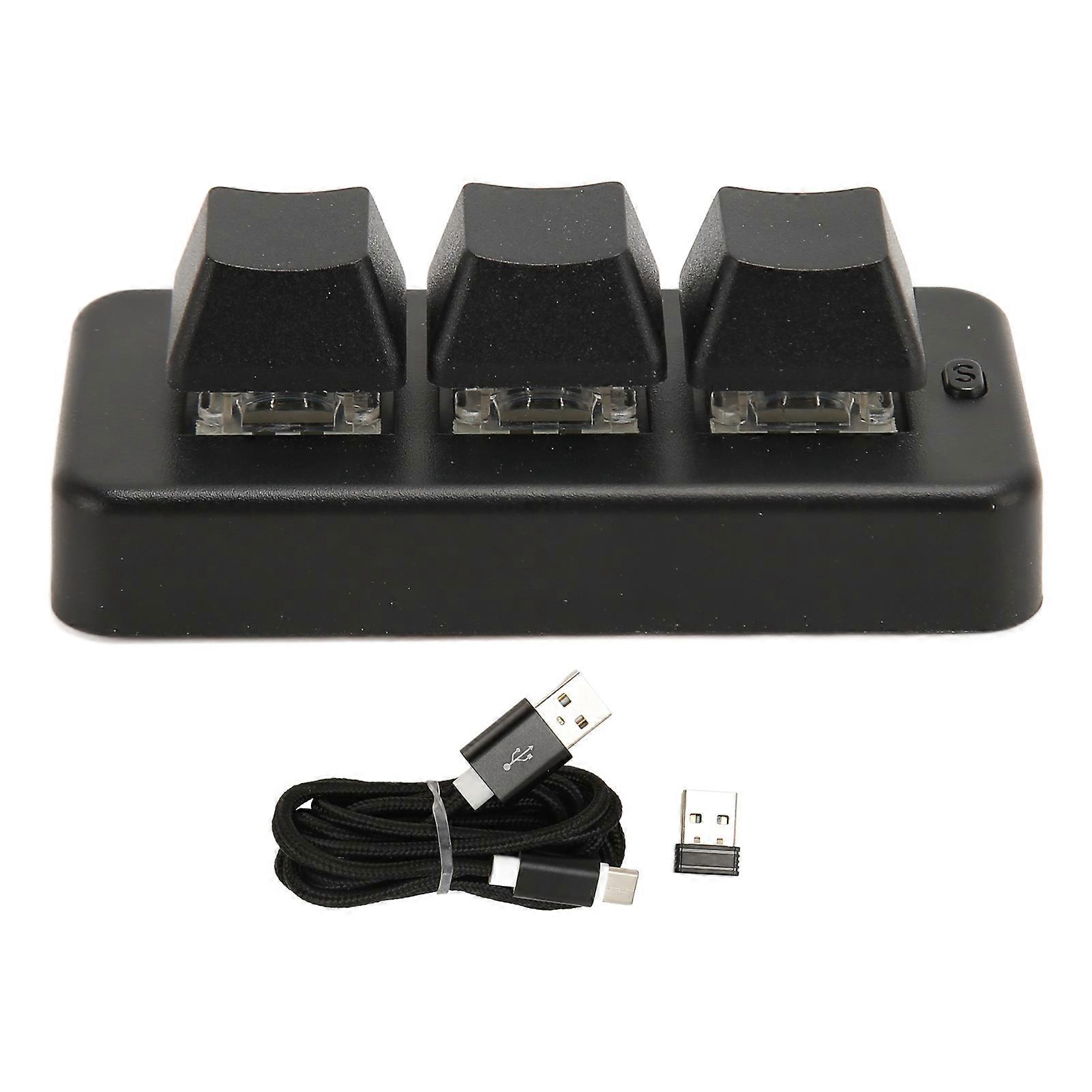 Product Description: 3 Key Mini Keypad 3 Mode USB Wireless 2.4G Bluetooth HID Programming Blue Switch Mini Macro Mechanical Keyboard Elevate your typing experience with the 3 Key Mini Keypad, a versatile and compact mechanical keyboard designed for both productivity and gaming. This innovative keyboard combines advanced features with a user-friendly design, making it the perfect addition to your workspace or gaming setup. Discover the key features that set this mini keypad apart: 3 Mode Connectivity The 3 Key Mini Keypad offers three connectivity options: wired USB, wireless 2.4G, and Bluetooth. This flexibility allows you to choose the most suitable connection for your needs, whether you prefer a stable wired connection or the convenience of wireless. Seamlessly switch between devices and enjoy a hassle-free experience. Blue Switch Design Experience the satisfying tactile feedback of blue switches with this mechanical keyboard. The keys are designed for comfort and responsiveness, making them ideal for extended use during long office hours or intense gaming sessions. Enjoy a delightful typing experience that enhances your productivity and gaming performance. HID Programming Unlock the full potential of your keyboard with HID programming capabilities. This feature allows users to customize keyboard functions through downloadable programming software, tailoring the keypad to meet individual preferences. Personalize your setup to enhance efficiency and streamline your workflow. Multifunctional S Keys The keyboard is equipped with multifunctional S keys that enable you to switch key value layers effortlessly. Each layer can be programmed with different functions, allowing three keys to provide nine customizable functions. This feature enhances your work and gaming efficiency, giving you quick access to essential commands. Lightweight and Portable Designed with portability in mind, the 3 Key Mini Keypad is compact and lightweight, making it easy to carry wherever you go. Whether you're traveling for work or heading to a gaming event, this mini keyboard fits perfectly in your bag, ensuring you can enjoy a high-quality typing experience on the go. Upgrade your setup with the 3 Key Mini Keypad and enjoy the perfect blend of functionality, comfort, and portability. Whether for work or play, this mini mechanical keyboard is designed to meet your needs and enhance your overall experience. Get ready to type, game, and create with ease!