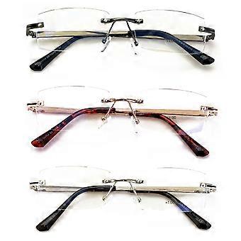 3 Pairs Men Full Rimless Reading Glasses Metal Frame- Rectangular Anti Blue Blocker UV Protection Reader with Daimond Cut Clear Lens 1.00