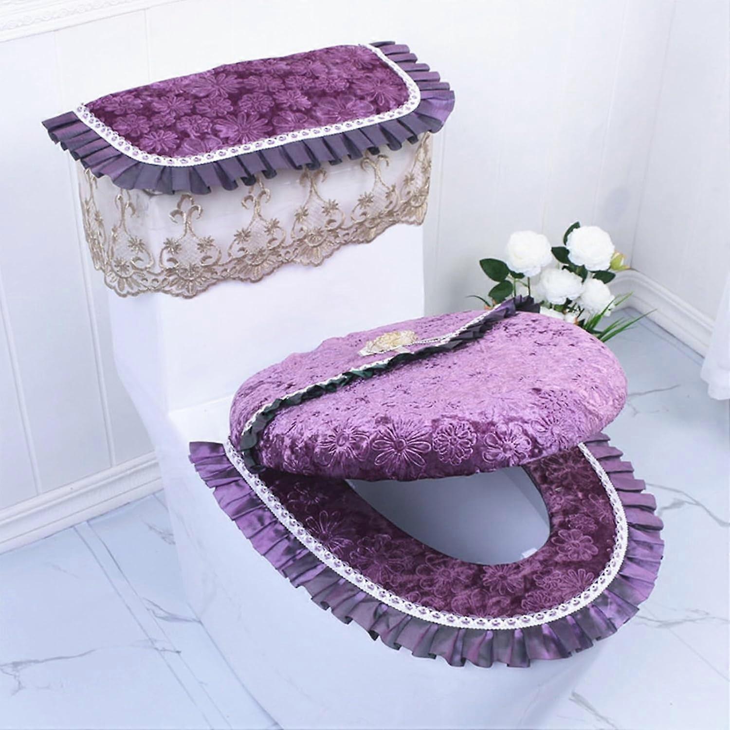 3PCS Toilet Seat Cover Set Purple Toilet Seat Lid Tank Cover for Bathroom Lace Thicker Toilet Seat Cushion Warmer Washable