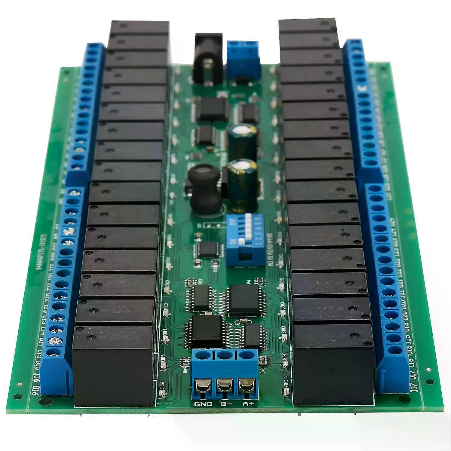ABYA R421C32 DC12V 32 Channels Modbus RTU RS485 Bus Relay Module UART Serial Port Board for PLC LED Home Automation Door Lock 1. DC 12V power supply._x000D_ 2. standby current (all relays closed) 9MA, all 32 open relays 150ma_x000D_ 3. " open " " close " " Momentary " " Self-locking " " Interlock " " Delay " 6 commands_x000D_ 4. MODBUS RTU 5. under the "delay" , the maximum delay is 255 seconds_x000D_ 6. MODBUS Commands can be made serial hyperterminal (serial assistant) or 'modbus Poll' enter._x000D_ 7. under the MODBUS mode, it can support up to 64 devices in parallel_x000D_ 8. size: 180x90x20mm_x000D_ 9. Weight: 296g_x000D_ 10. maximum load: 10A / 250VAC, 10A / 125VAC_x000D_ colour:black_x000D_ Material:plastic_x000D_ Package Contents:_x000D_ 1 * DC 12V 32 Channels R-S485 Modbus RTU Relay Module_x000D_ _x000D_ Only the above package content, other products are not included._x000D_ Note: Light and different displays may cause the color of the item in the picture a little different from the real thing. The measurement allowed error is +/- 1-3cm. _x000D_ _x000D_ _x000D_ _x000D_ _x000D_ _x000D_ _x000D_
