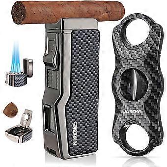 All-in-One-Zigarrenanzünder mit V-förmigem Zigarrenschneider, eingebautem Zigarrenlocher, Zigarrenhalter, vier winddichten Jet-Flammen, nachfüllbarem 4-in-1-Taschenlampenanzug