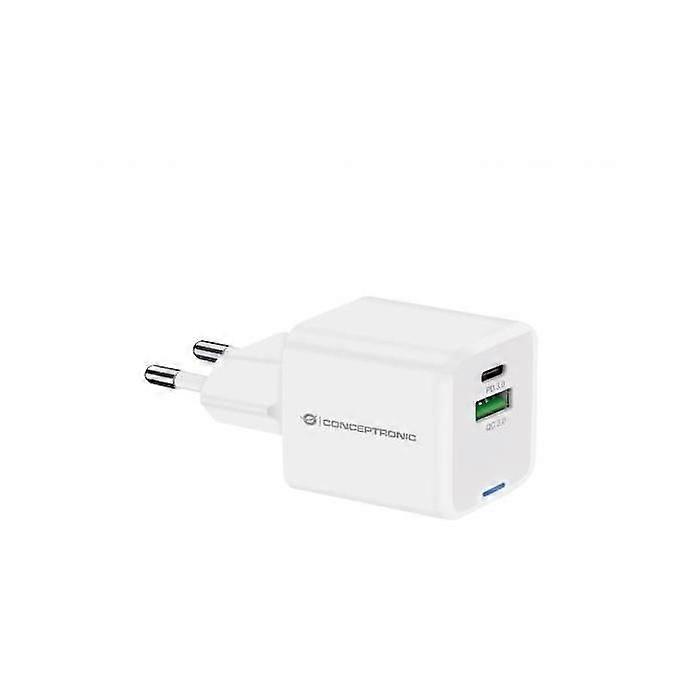 TELEPHONY, CHARGER, WALL, Conceptronic Althea15w 2-port 20w Gan UsbConceptronic ALTHEA15W 2-Port 20W GaN USB PDALTHEA15W - 2-port 20 W PD USB GaN Charger, USB-C x 1, USB-A x 1, QC 3.0, PPSConceptronic ALTHEA15W. Charger type: Indoor, Power source type: AC, Charger compatibility: Universal. Input voltage: 100 - 240 V, Output voltage (max): 12 V. Quantity of USB Type C ports: 1, Fast charging, Electrical protection devices: Overheat, Overload, Short circuit. Product color: White representation / realization Charger type Indoor Charger compatibility Universal Power source type AC Number of connected devices simultaneously (max) 2 Quantity of USB Type A ports 3.2 Gen 1 (3.1 Gen 1) 1 Quantity of USB Type C ports 1 Fast charging Yes Fast charging technology Power Delivery, Quick Charge 3.0 Electrical protection devices Overheat, Overload, Short circuit Design Product color White Gallium nitride (GaN) transistors Yes Power Input voltage 100 - 240 V Input frequency 50 - 60 Hz Input current 0.5 A Max power 20 W Output voltage (max) 12 V Output voltage (min) 3.3 V Output current (5V) 3 A Output current (9V) 2.22 A Output current (12 V) 1.67 A Weight and dimensions Width 35 mm Depth 72 mm Height 34 mm Weight 50 g Packaging information Package width 54 mm Package depth 172 mm Package height 37 mm Package weight 37 g Packaging type Box Conditions