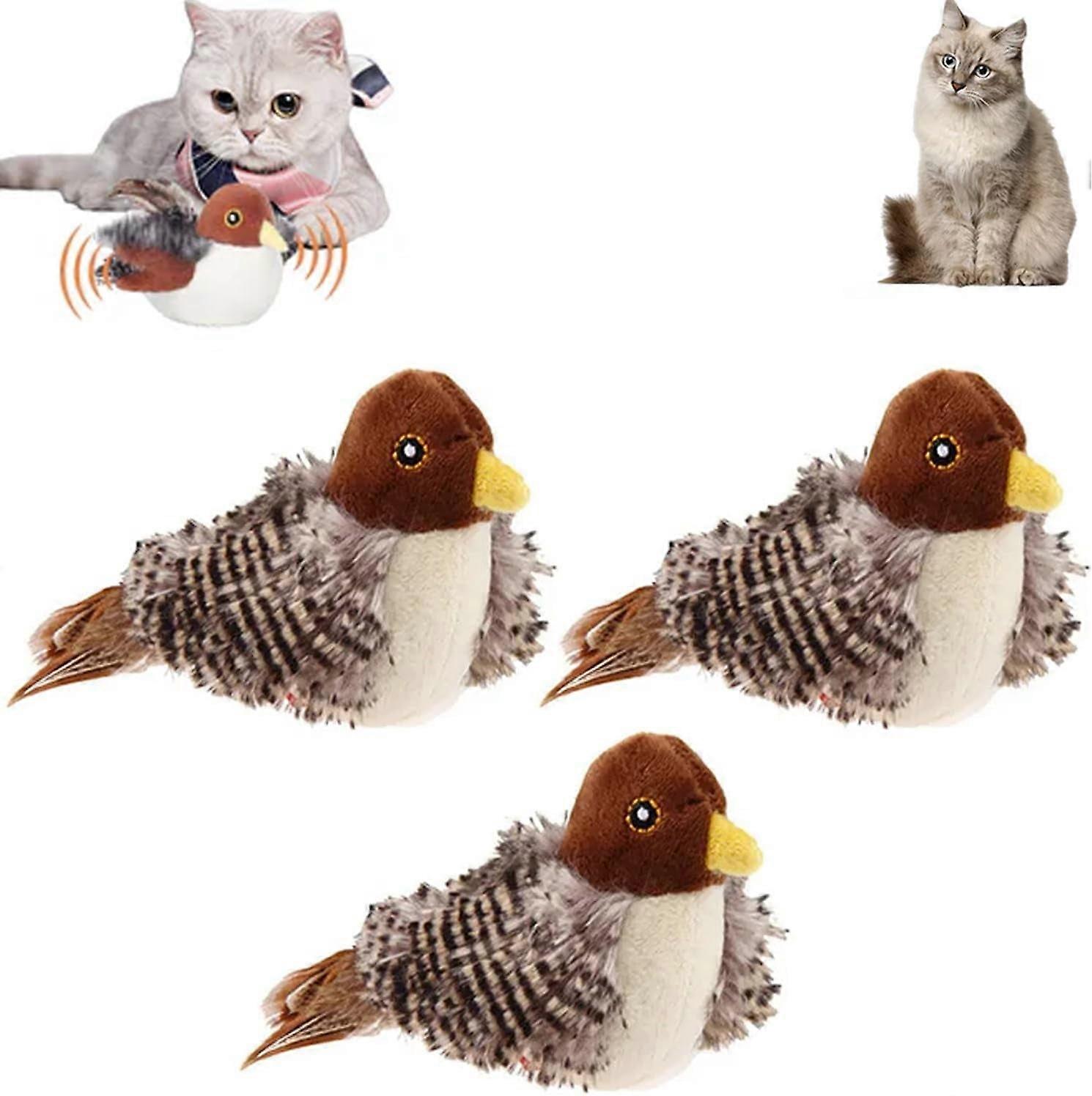 Product DescriptionSpecification: Material: Soft plush, safe and durability Size & Weight: Approximately 4 inches in length, 0.5 pounds in weight Package Includes: 1/2/3PCS Simulated Chirping Bird Cat Toy Interactive Chirping and Flapping Action: This lifelike sparrow toy is designed to captivate your cat's attention with its realistic chirping sounds and flapping wings. Every time your feline friend touches the toy, it activates, creating an irresistible playtime experience that mimics a real bird in flight, keeping your cat engaged and entertained Flaps and Chirps to Stimulate Hunting Instincts: The toy not only looks like a real sparrow but also acts like one! Its wings flap and it chirps just like a bird, triggering your cat's natural hunting instincts. This dynamic interaction ensures hours of fun and keeps your cat mentally and physically stimulated USB Rechargeable for Endless Play: Forget about constantly changing batteries. With its USB rechargeable feature, this toy offers continuous fun without the hassle, allowing your cat to enjoy the flapping and chirping without interruptions Silvervine and Catnip Blend: Enhance your cat's playtime with the included silvervine and catnip blend. The natural ingredients create an irresistible allure that drives your cat wild with excitement, followed by a calm bliss Durability and Washable Design: Built to withstand bites and rough play, this toy is made from durability, safe plush material that can be easily removed for washing, ensuring a healthy and long-lasting playtime for your cat-MOTYEAK
