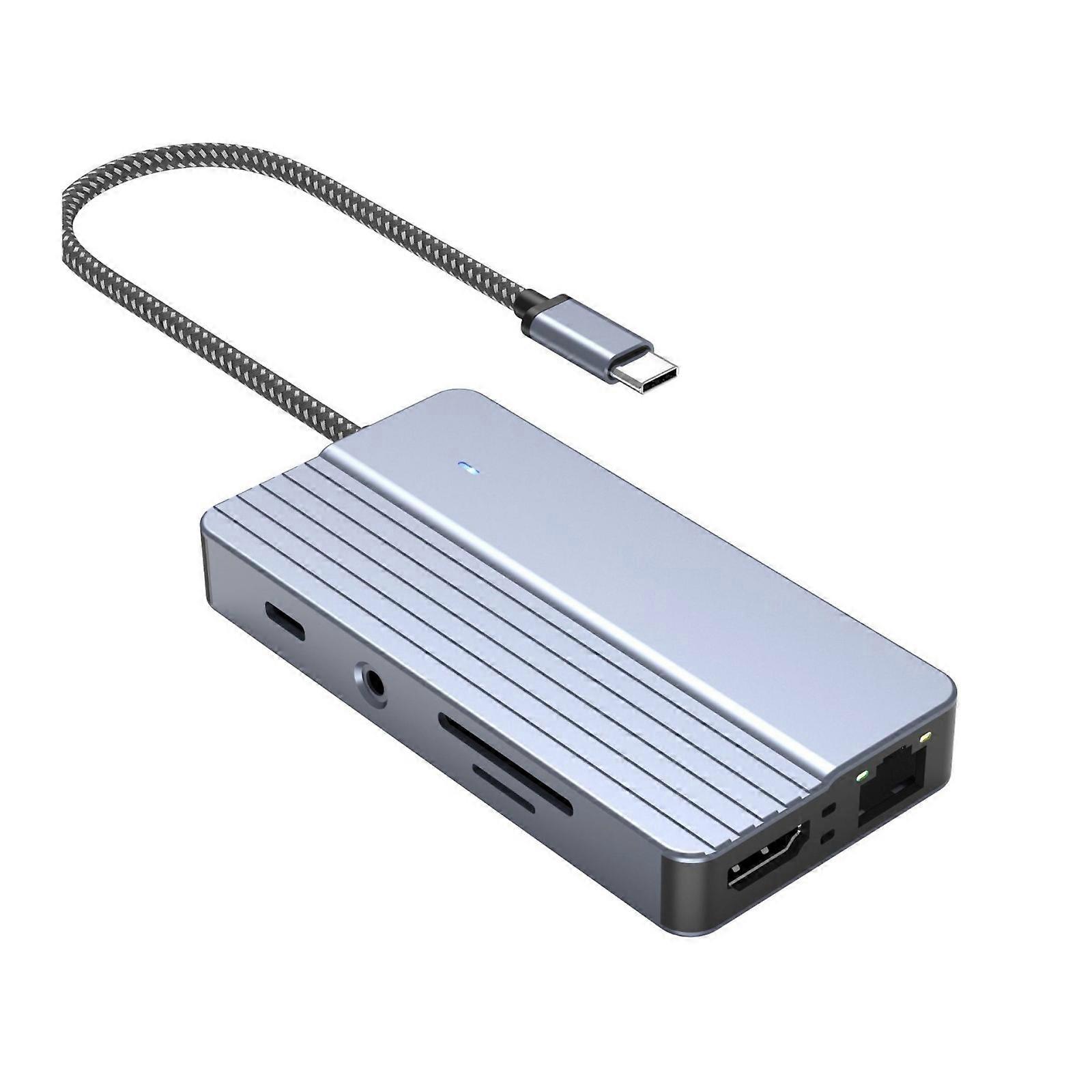 Features: Experience seamlessly connectivity with our 10 in 1 USB C Hub, featuring HDTV 4K30Hz, RJ45 Ethernet, USB3.0, audios 3.5mm port, and memory card reader,PD100W Charging port perfect for enhancing your devices capabilities. This hub supports high resolution 4K30Hz HDTV output, stable 100Mbps Ethernet connection, 5Gbps data transfer via USB3.0, and PD100w fast charging. Suitable for professionals, gamers, and students who need reliable and multifunctional connectivity solution for their devices. Perfect for use in office setting, during travel, or at homes, this compactly and lightweight hub ensures you stay connecting. Compatible for wide ranges of devices including laptops, tablets, and smartphones, this metal hub is for durability and efficiency, making it essential accessory for modern digital lifes. Specifications: Component:Metal Size:Approx.15x8.5x2.4cm/5.91x3.35x0.95inch Interfaces:USB2.0 480Mbs Data Transfer,USB3.0 5120Mbs Data Transfer,Support 3.5mm Audios,RJ45 100Mbps,HDTV 4K30Hz,Memory Card Reader,PD100W Charging; Package Includes: 1pc USB C to HDTV Adapter note: Please allow 1mm errors due to manual measurement. Due to the differences between different monitors, the picture may not reflect the actual item color.