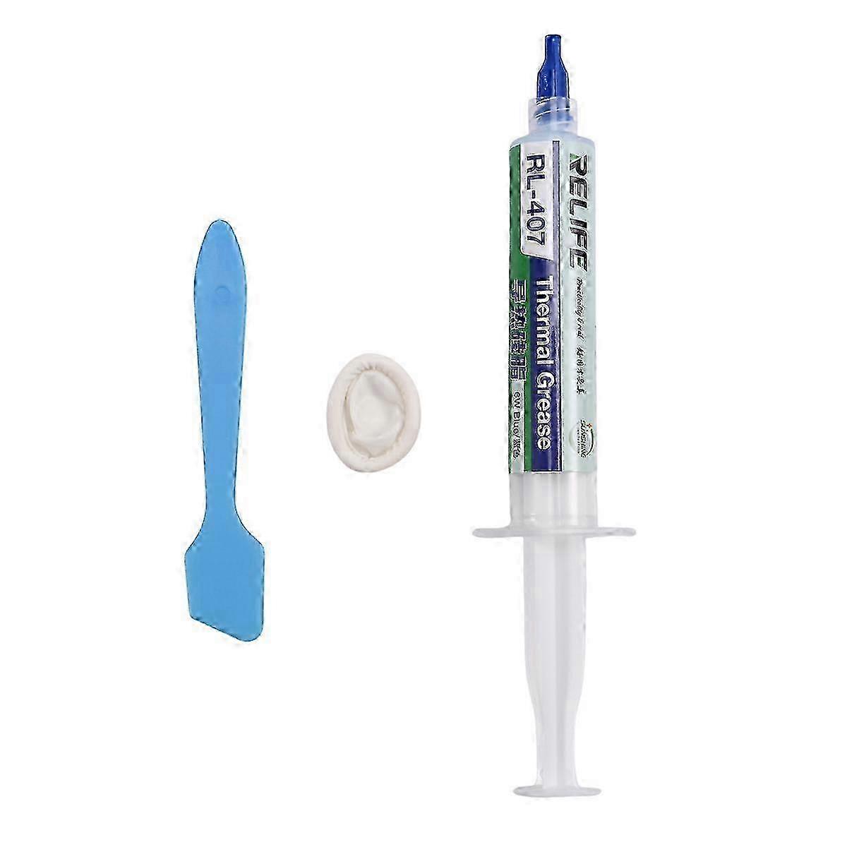 Name: Thermal silicone Model Number: RL-407 Thermal conductivity 6.0W/, heat and humidity resistance, environmental aging resistance, easily cope with the heat brought by high power consumption CPU/GPU Colour: Blue Material: Plastic Package Contents: 1 x Thermal paste 1 x Finger sleeve 1 x Plastic Only the above package content, other products are not included. Note: Light reflection and different displays may cause the color of the item in the picture a little different from the real thing. The measurement allowed error is +/- 1-3cm. Note: Due to the light and screen setting difference, the item's color may be slightly different from the pictures. Please allow slight dimension difference due to different manual measurement.