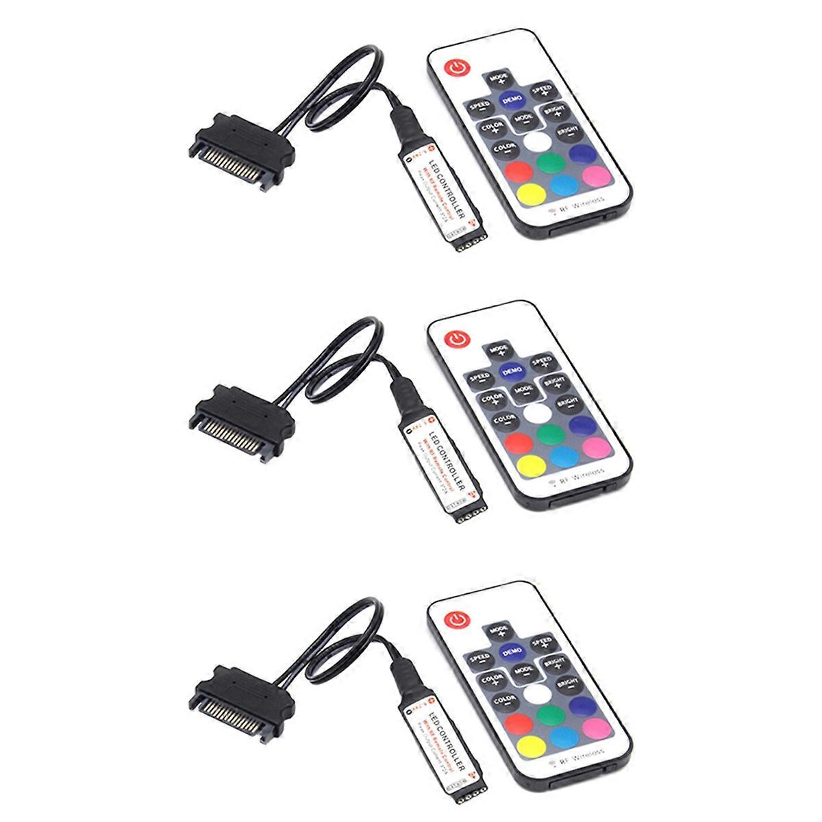 remote control led Dimmer can control brightness of led strip, flashing, and flashing mode. Latest products, control RGB color led strip working modes, make RGB color led strip variable. Contact ways: common anode Work temperature: -20-60 Input voltage: 12 V Mainly use PC computer lighting, etc. Connector: SATA Colour: black Material: plastic Package Contents: 3 x RGB Controller Only the above package content, other products are not included. Note: Light reflection and different displays may cause the color of the item in the picture a little different from the real thing. The measurement allowed error is +/- 1-3cm.