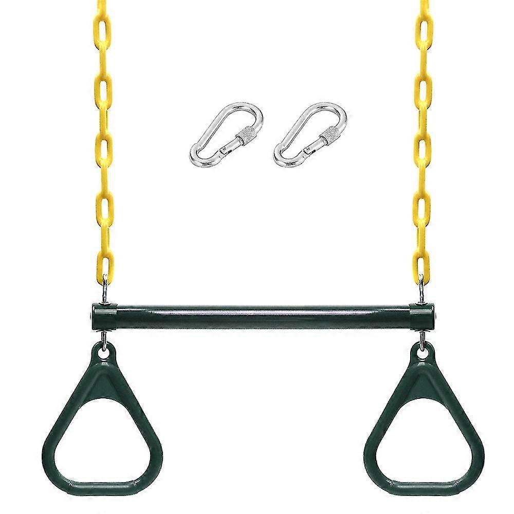 1. The heavy duty swing set accessories are fully assembled. It is a swing for kids to enjoy outdoor family fun. 2. Features: Fully equipped with 1 trapeze bar, 2 rings, 2 chains and 2 carabiners, easy to set up. Plastic coated swing bar, chains and rings are smooth, rust resistance and little hurt to kid's hands. You can easily change the height of the chain to be higher or lower. Holds up to 200 kg / 440.9 lb. 3. Specifications: Material: PVC + Steel pipe. Color: Blue / Green ( optional ). Capacity: 100 kg / 220.5 lb. Chain Length: 120 cm / 47.2 in. Bar Length: 45 cm / 17.7 in. Packing Size: 46.5 * 24.5 * 5 cm / 18.3 * 9.6 * 2.0 in. Packing Weight: 1.3 kg / 2.9 lb. 4. Package List: 2 * Rings. 1 * Trapeze Bar. 2 * Chains. 2 * Carabiners.