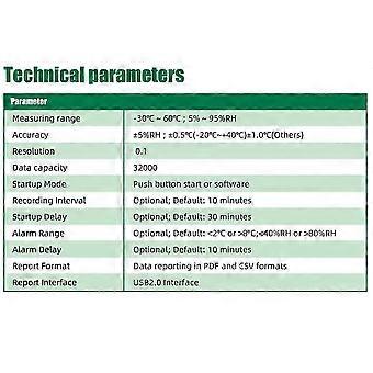 Dieser intelligente Temperatur- und Feuchte-Datenlogger ist mit einem hochpräzisen Temperatur- und Feuchtigkeitssensor ausgestattet. Gleichzeitiges Messen und automatisches Aufzeichnen von Temperatur und Luftfeuchtigkeit bei wiederverwendbarer Verwendung. Intuitives LCD-Display. Auf dem LCD werden alle wichtigen Informationen angezeigt, einschließlich Aufzeichnungsstatistiken, Alarme und Betriebsstatus. Generiert automatisch einen PDF-Bericht und eine CSV-Datei, zum Exportieren von Daten ist keine Software erforderlich. Eingebaute USB 2.0-Schnittstelle, kann jederzeit und überall schnell mit dem PC verbunden werden, ohne Kabel und zum Herunterladen von Daten. Parameter programmierbar durch Konfigurationssoftware. Es wird häufig für die Temperaturaufzeichnung während der Lagerung und des Transports von Lebensmitteln, Chemikalien und anderen Produkten verwendet, insbesondere in allen Arten der Lagerverwaltung, Logistik und Kühlkette, wie z. B. Kühlcontainer, Kühlverpackungen, Kühlhäuser, Labore usw. Leistungsbeschreibung: Feuchtigkeitsmessbereich: 5% -95% RH Temperatur-Messbereich: -30 -60 Genauigkeit: 5% RH; 0,5 (-20-40), 0,1 (andere) Auflösung: 0,1% RH, 0,1 Datenkapazität: 32000 Startmodus: Schaltfläche Start oder Software Aufnahmeintervall: fakultativ; Standardwert: 10 Minuten Startverzögerung: fakultativ; Standardwert: 30 Minuten Alarmbereich: optional; Standardwert: Kleiner als 2 oder 8; Weniger als 40 % relative Luftfeuchtigkeit oder 80 % relative Luftfeuchtigkeit Alarmverzögerung: optional; Standardwert: 10 Minuten Form des Berichts: Datenbericht im PDF- und CSV-Format Schnittstelle: USB2.0-Schnittstelle Farbe: Weiß & Grün Material: Kunststoff Das eigentliche Produkt kann geringfügige Farbunterschiede oder Unterschiede aufweisen, die die Verwendung nicht beeinträchtigen Packungsinhalt: 1 * Temperatur- und Feuchtigkeitsrekorder Nur der oben genannte Packungsinhalt, andere Produkte sind nicht enthalten. Hinweis: Lichtreflexion und unterschiedliche Displays können dazu führen, dass die Farbe des Artikels auf dem Bild etwas von der Realität abweicht. Der zulässige Messfehler beträgt +/- 1-3 cm.