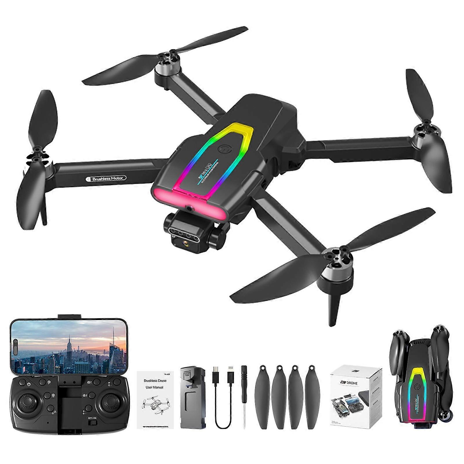 WJSXC FPV Drone with 2.4G RC, Brushless Motor, Altitude Hold, Obstacle Avoidance, LED Lights - Black
